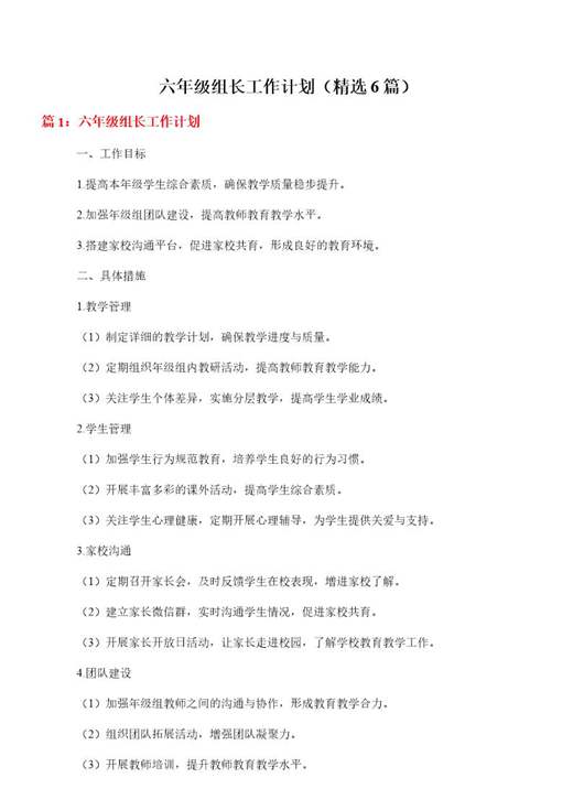 1.教学管理(1)制定详细的教学计划,确保教学进度与质量。(2)定期组织年级组内教研活动,提高教师教育教学能力。(3)关注学生个体差异,实施分层教学,提高学生学业成绩。2.学生管理(1)加强学生行为规范教育,培养学生良好的行为习惯。(2)开展丰富多彩的课外活动,提高学生综合素质。(3)关注学生心理健康,定期开展心理辅导,为学生提供关爱与支持。3.家校沟通(1...